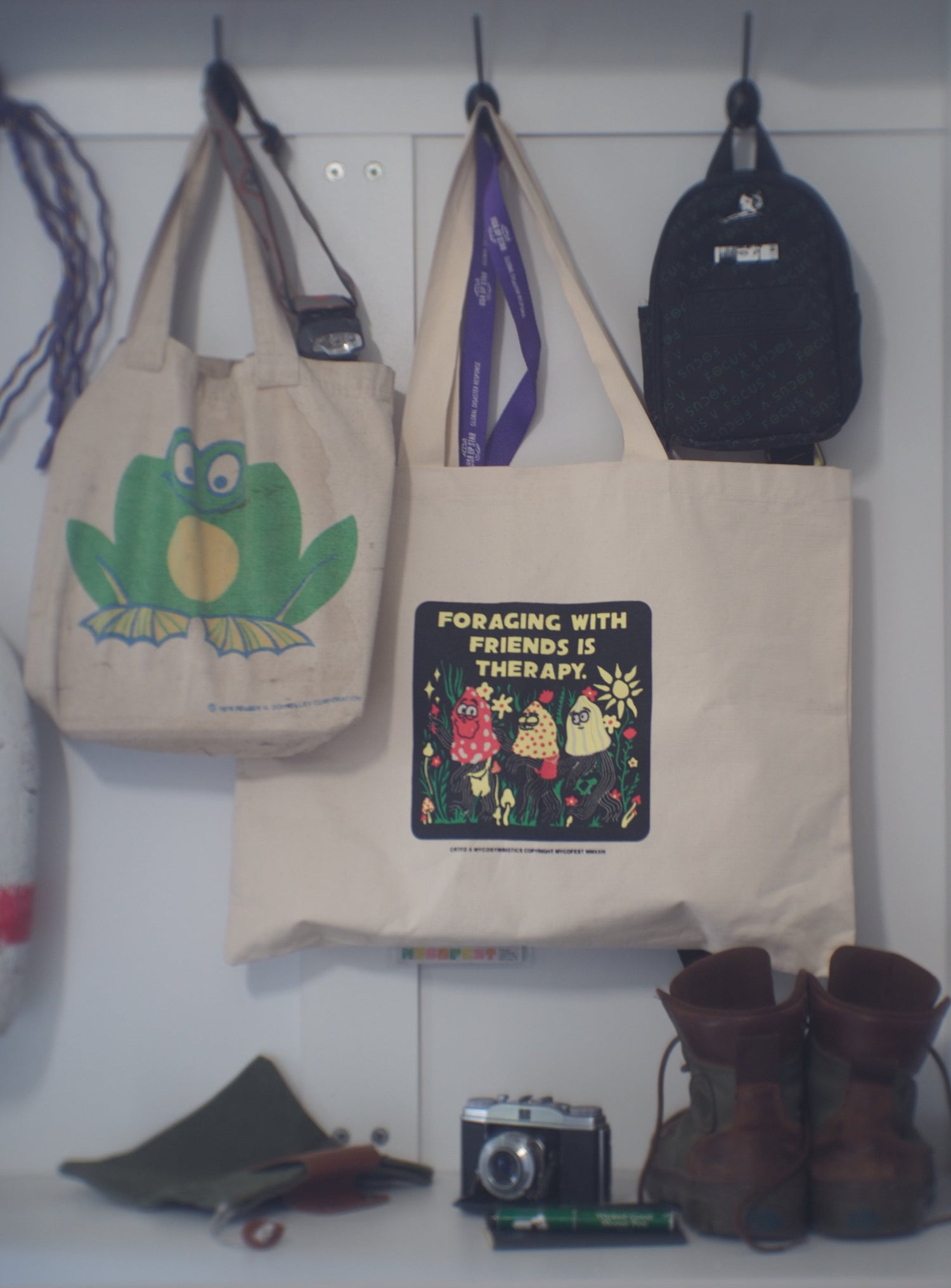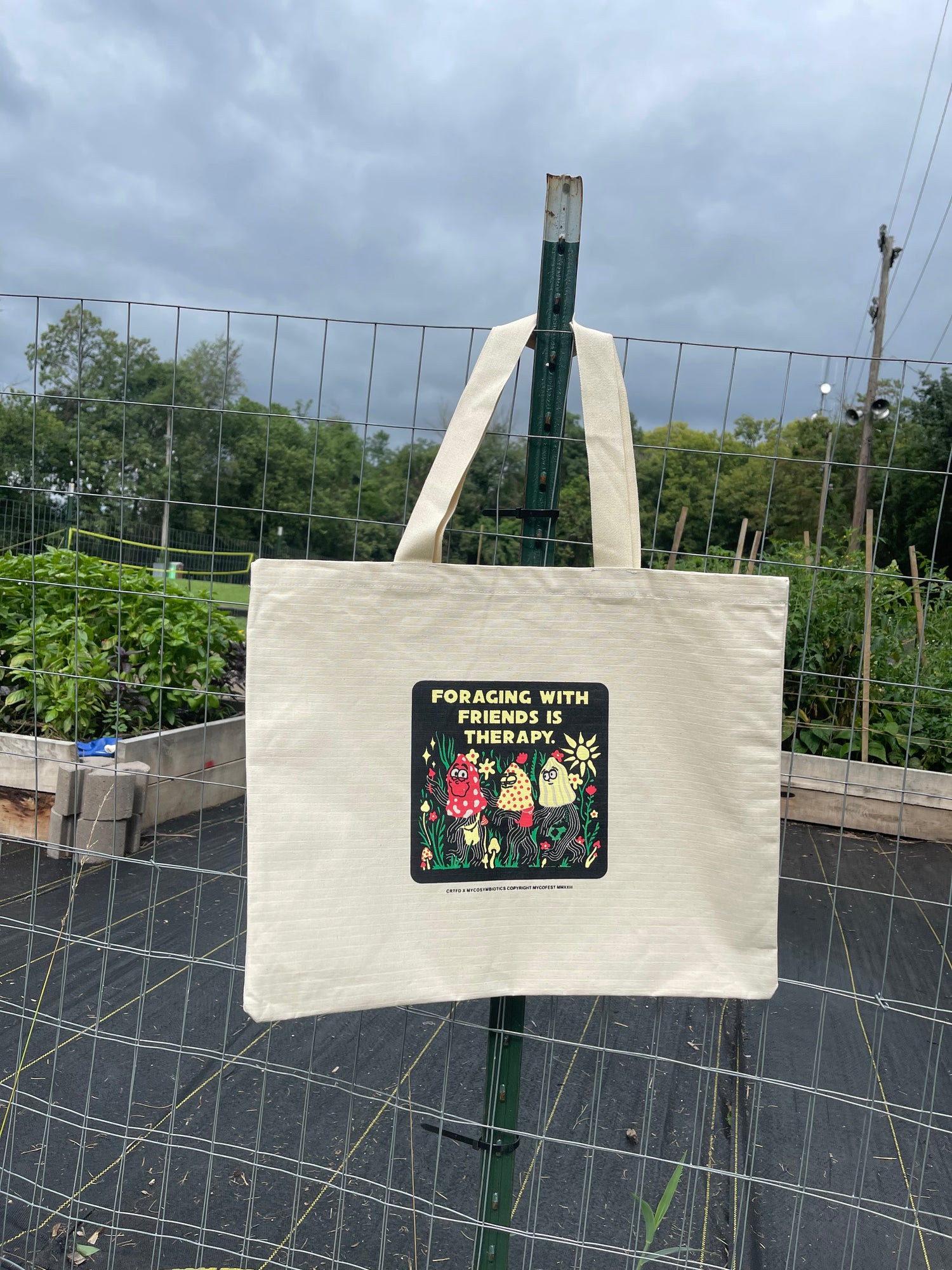 Foraging with Friends is Therapy oversized canvas tote, made with deadstock water-resistant textiles.