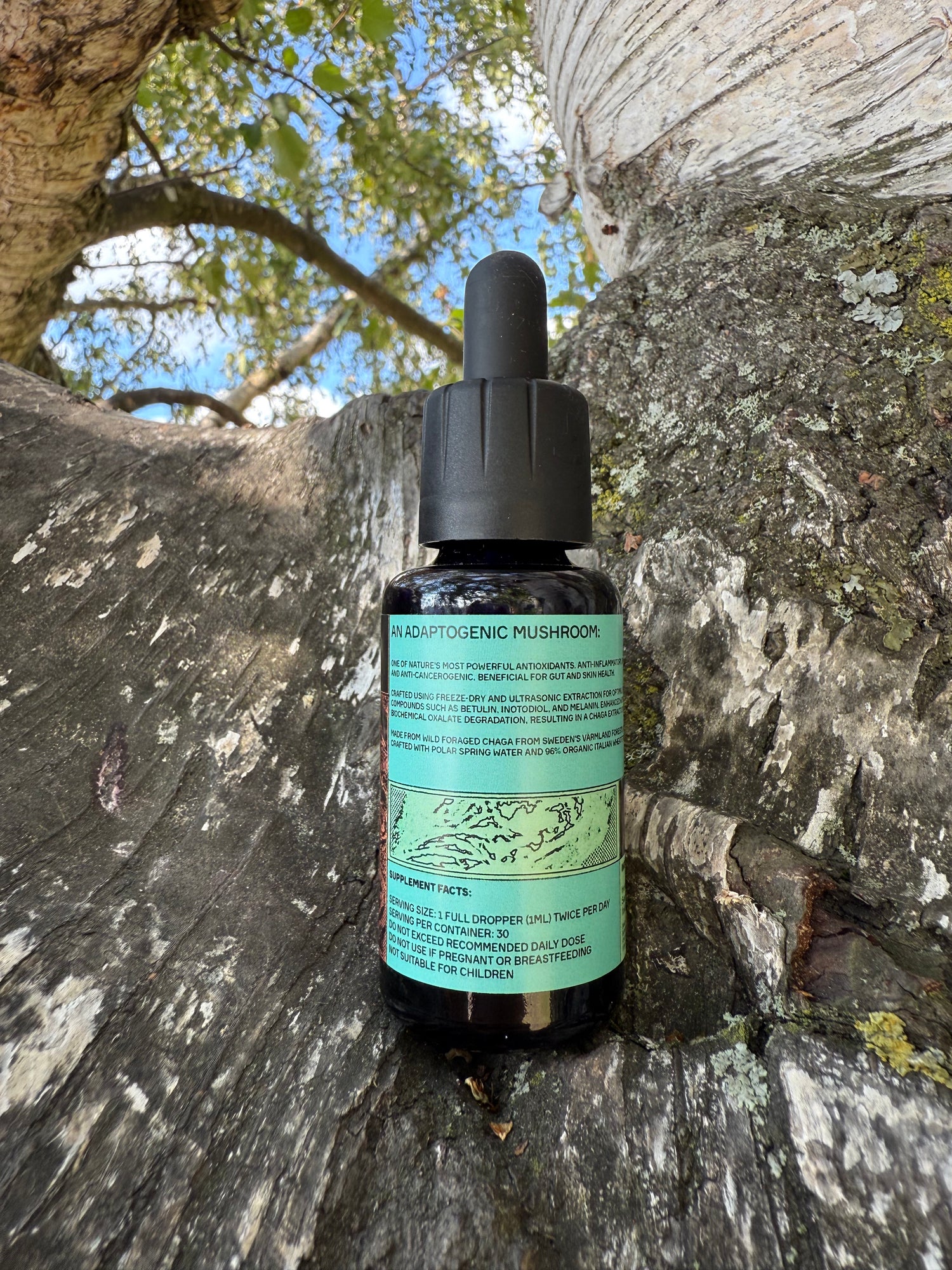 Made from Wild Foraged Chaga from Sweden's Värmland forests. Crafted with Polar spring water and 96% organic Italian wheat ethanol. Made in the EU with Mycelium Hub