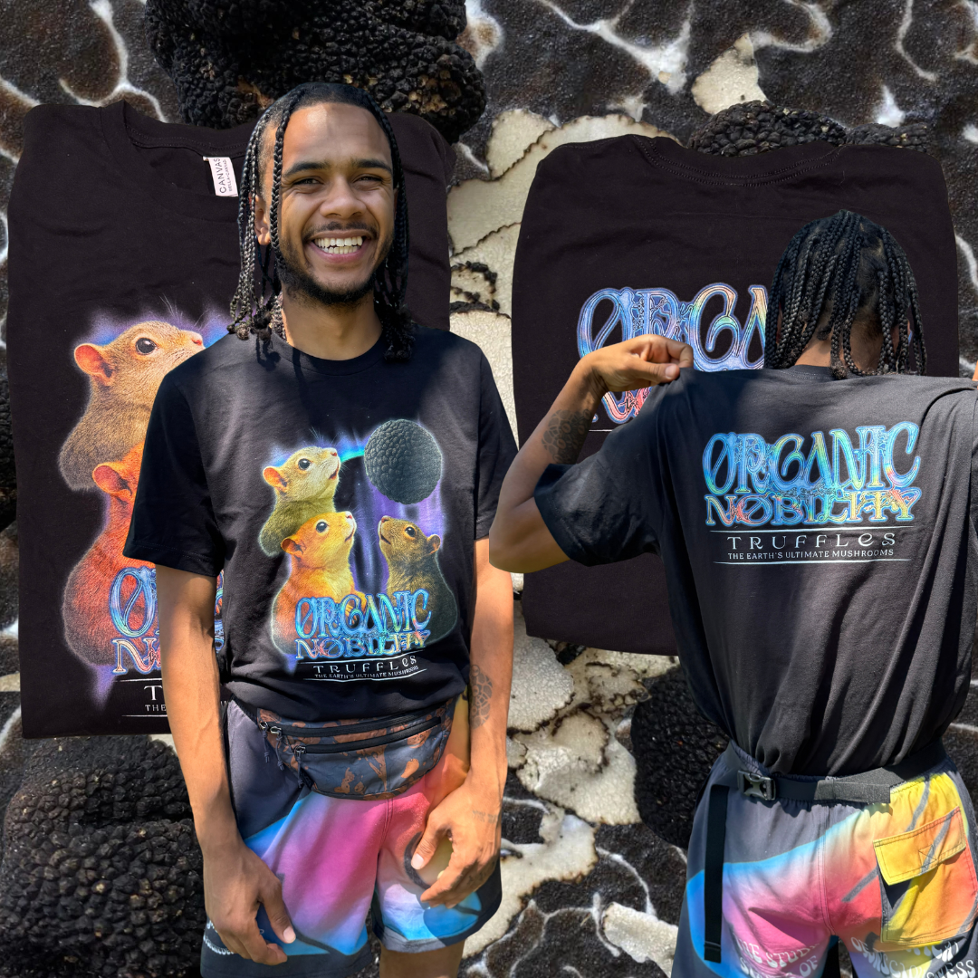 Squirrels have long been nature’s accidental mycologists, digging, burying, and rediscovering truffles, they shape forests through their instincts. This shirt honors that hidden alliance between mammal and mushroom.
