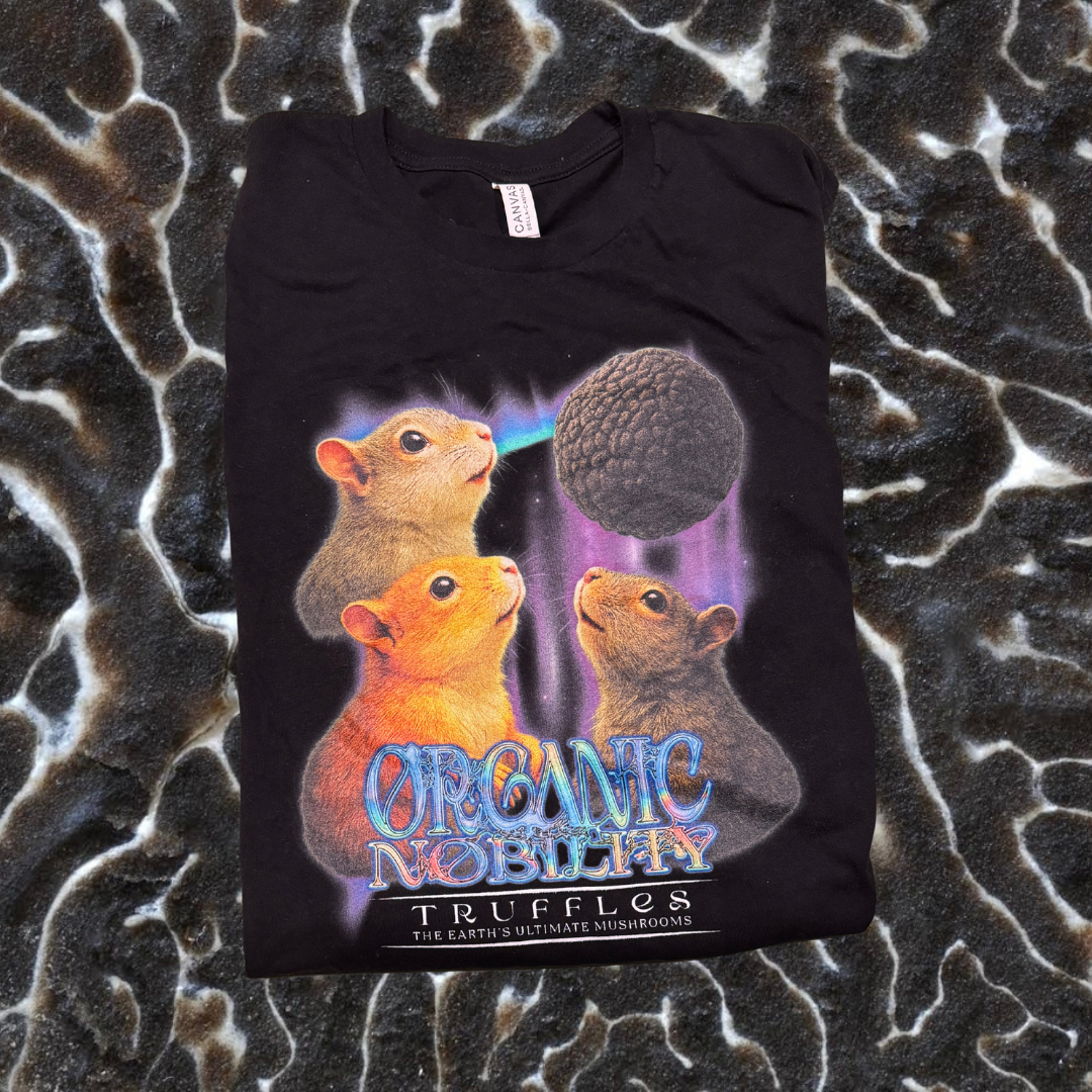 This vibrant tee celebrates the ancient and mystical bond between squirrels and truffles. Featuring a cosmic illustration of three squirrels gazing in awe at a levitating black truffle, this shirt symbolizes the natural intelligence of forest creatures and their role in the hidden fungal networks beneath our feet.